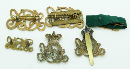 Six British Army Pay Corps metal badges including a Queen's Crown cap badge example