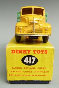 Dinky Toys diecast model Leyland Comet Lorry with yellow cab and chassis, mint green bed and green hubs, 417, in original box.