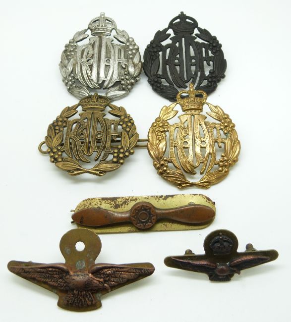 Seven Royal Australian Air Force metal badges comprising four hat and three insignia examples