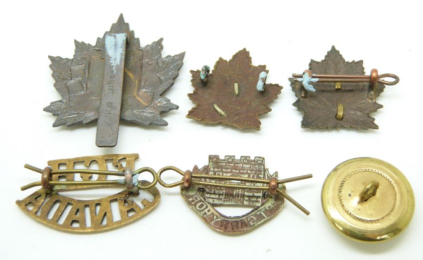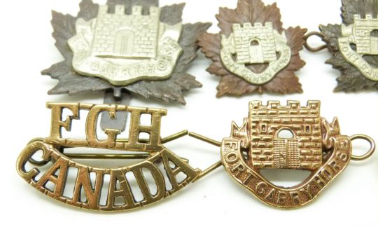 Four Canadian Army Fort Garry Horse metal badges together with a FGH shoulder title and button