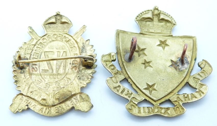 Two New Zealand Army WWI 28th/29th Reinforcements metal hat badges