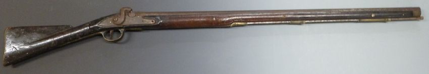 Percussion, converted from flintlock, hammer action Brown Bess gun with lock marked Tower and with crown over GR cypher, brass trigger, butt plate and mounts and 35inch barrel, overall length 130cm