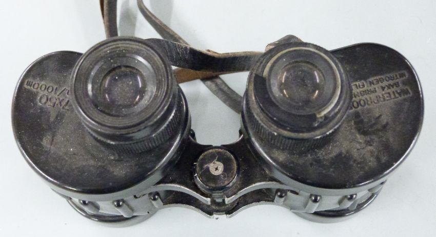 Two pairs of binoculars, one by Pancrama 10x50, the other 7x50, with paper and enamel racecourse badges, two hip flasks and a set of stacking metal cups in leather holder
