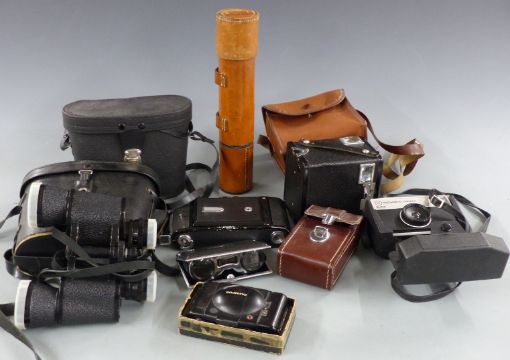 Cameras and bincoulars to include Zeiss Ikon Nettar 515/2, Parker-Hale Surespotter telescope, Bresser 8x21 binoculars, Boots 8x30 binoculars etc