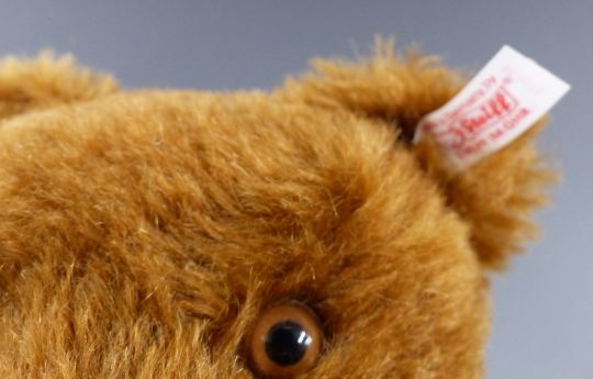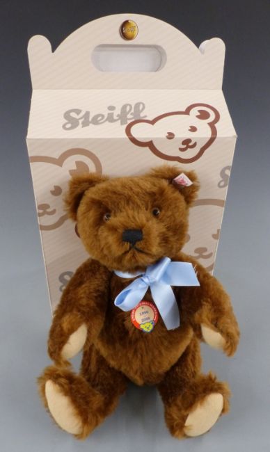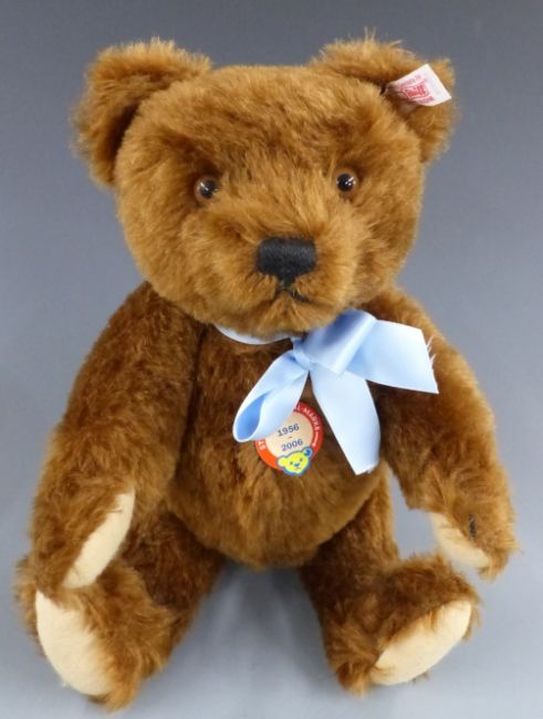 Steiff Original Teddy bear with brown mohair, beige pads and blue bow, 1956-2006, limited edition, 36cm tall, in original box.