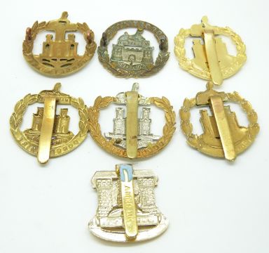 Seven British Army Dorsetshire / Dorset Regiment metal cap badges including a Victorian other ranks example
