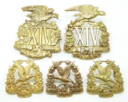 New Zealand Army 14th Otago Regiment metal cap and collar badges including a non voided example