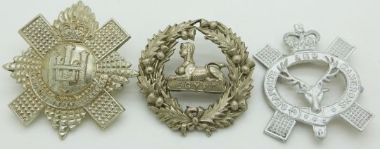 Three British Army Highland Light Infantry, Gordon Highlanders and Seaforth and Camerons Regiment piper's metal badges