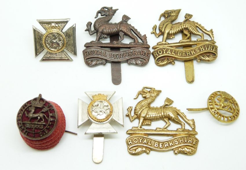 Seven British Army Royal Berkshire Regiment metal badges including officer's BOSS example