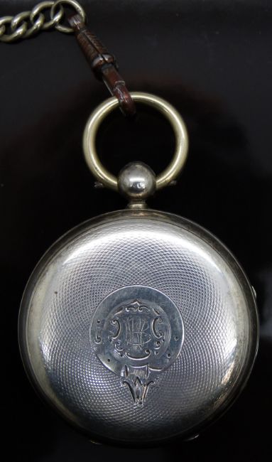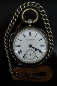 W C Bartlett of Cirencester hallmarked silver open faced pocket watch with inset subsidiary seconds dial, blued hands, black Roman numerals, white enamel dial, engraved case and signed movement, on graduated chain, case diameter 48mm, serial number 159489.
