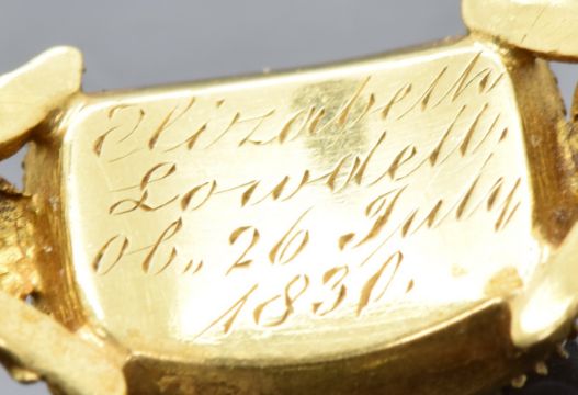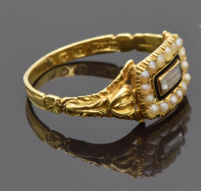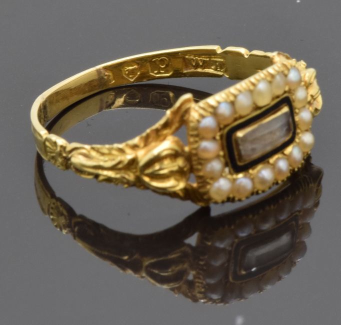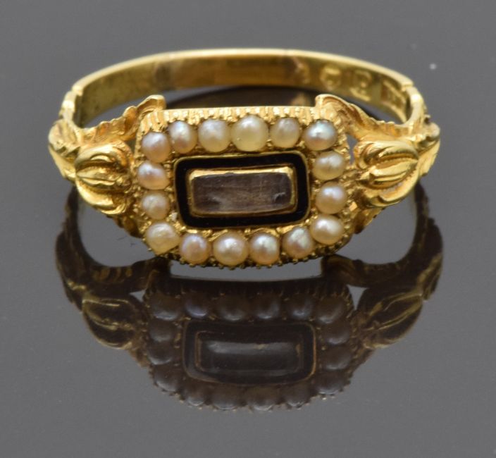 William IV 18ct gold mourning ring set with hair in a glass compartment surrounded by seed pearls, with engraved and embossed shoulders, the inner band inscribed "Elizabeth Lowdell Ob 26th July 1830", hallmarked London 1830, size O, 2.54g