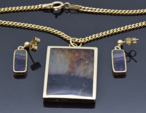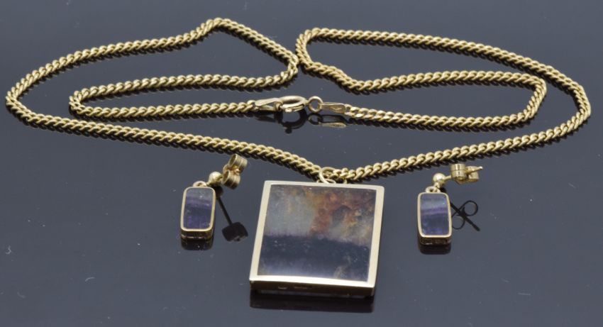 A 9ct gold pendant set with a rectangular section of blue john on 9ct gold chain with similar earrings, 21.6g