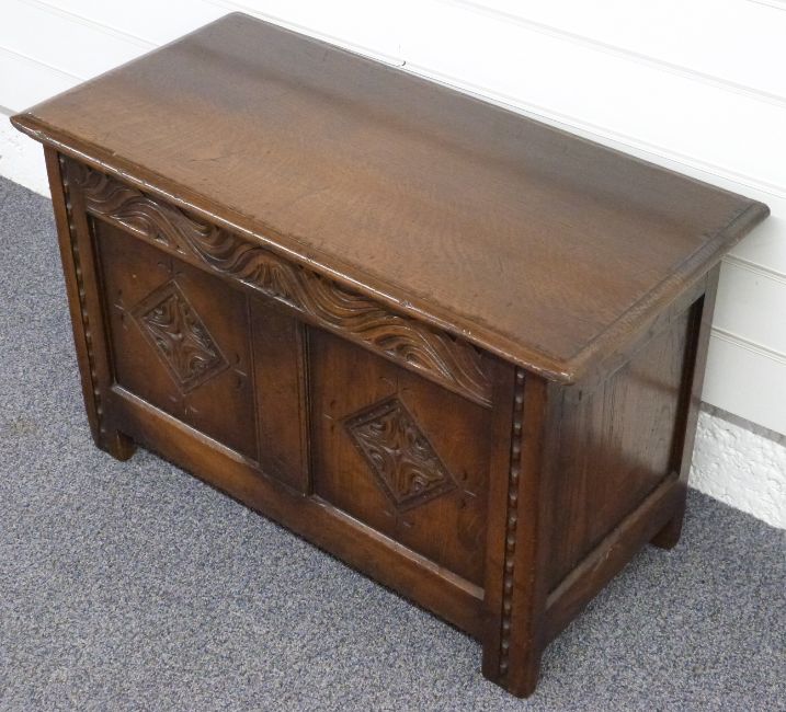 A small oak coffer with carved decoration, W77 x D38 x H48cm