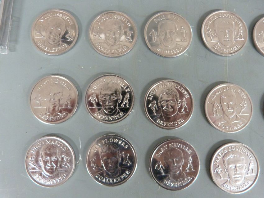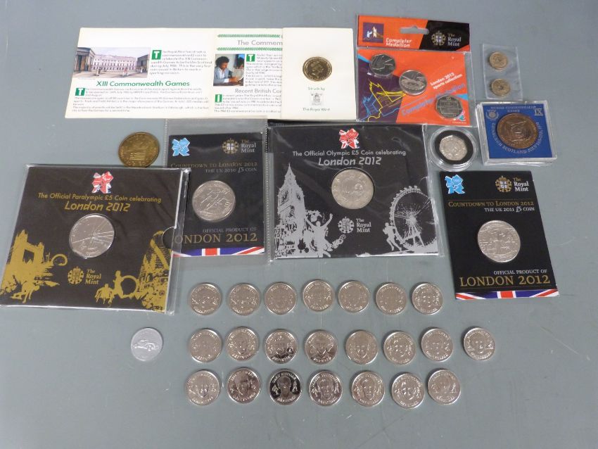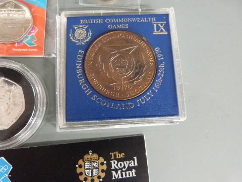 A collection of sporting related coins to include Olympics, off-side rule 50p, Commonwealth Games football squad official tokens etc