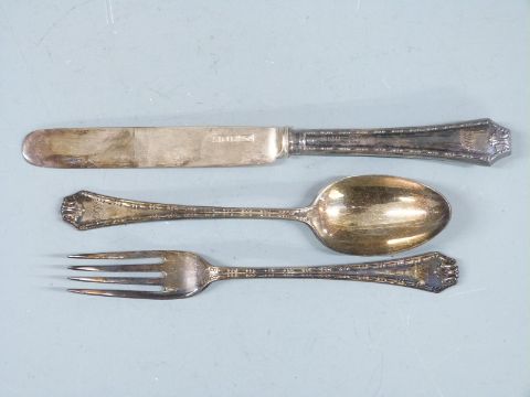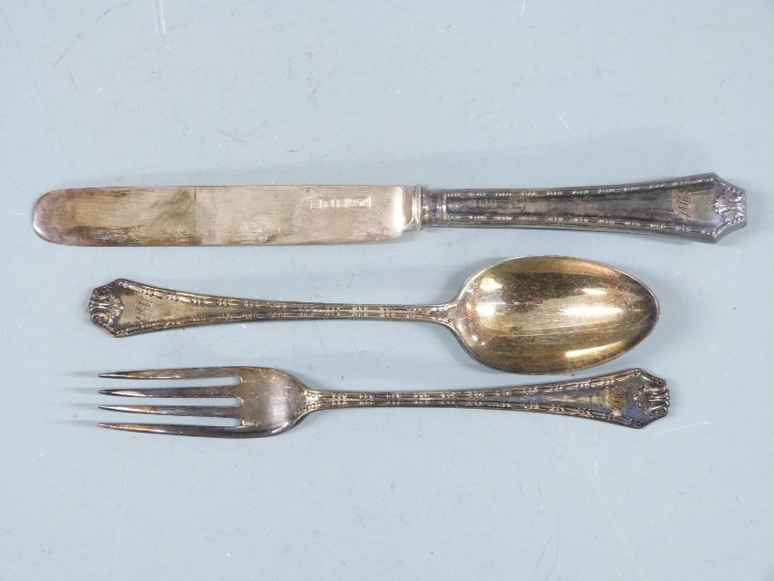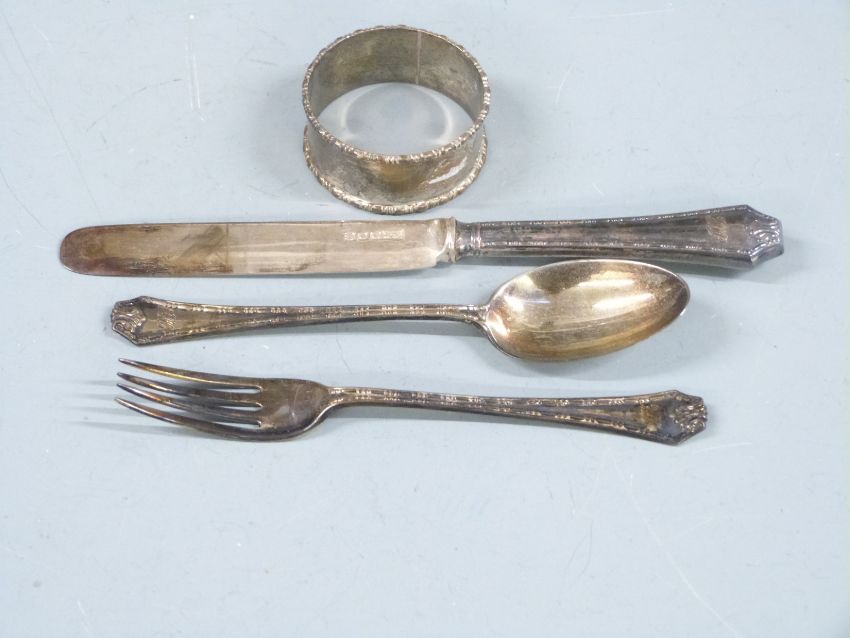 Mappin & Webb cased George V hallmarked silver spoon, fork, knife and napkin ring set, London 1927, weight 104g all in