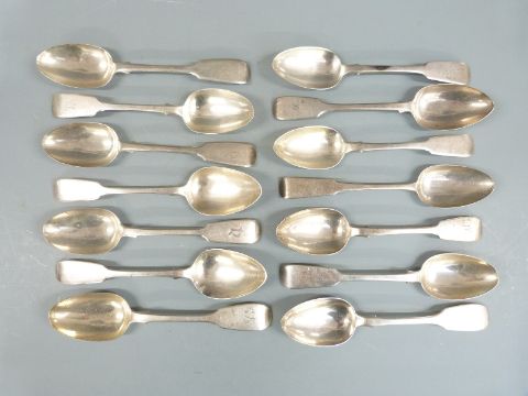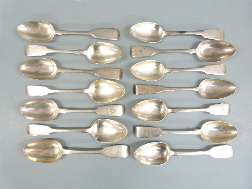 Fourteen 19th century fiddle pattern hallmarked silver fiddle pattern dessert spoons, all but one Victorian, the other earlier with Scottish marks, length 17.5cm, weight 590g