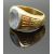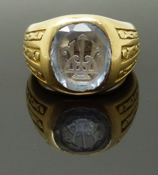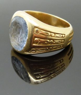 An 18ct French gold signet ring set with carved aquamarine, size O, 23.76g