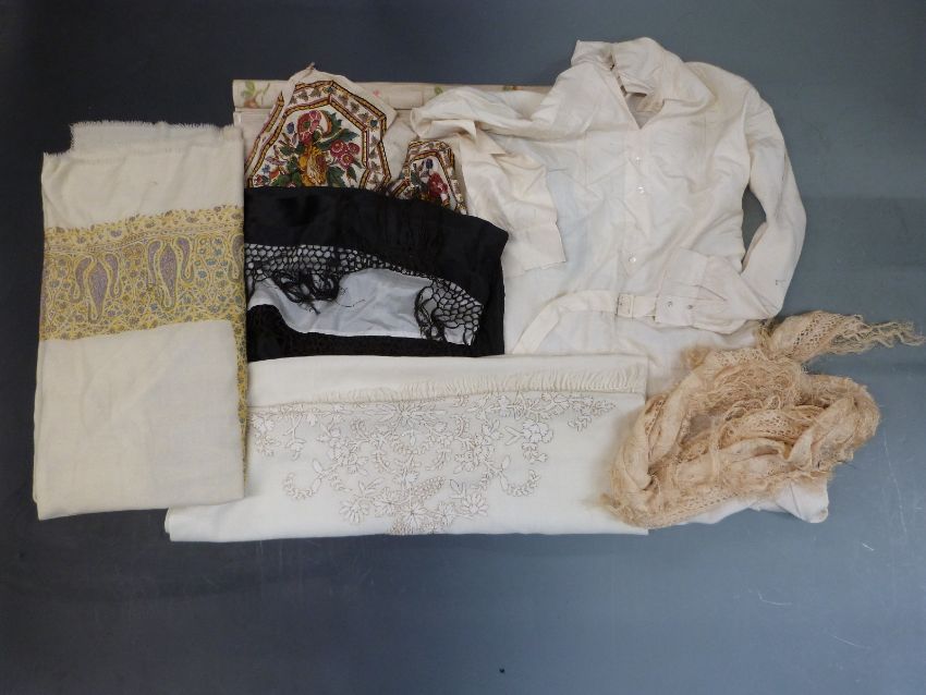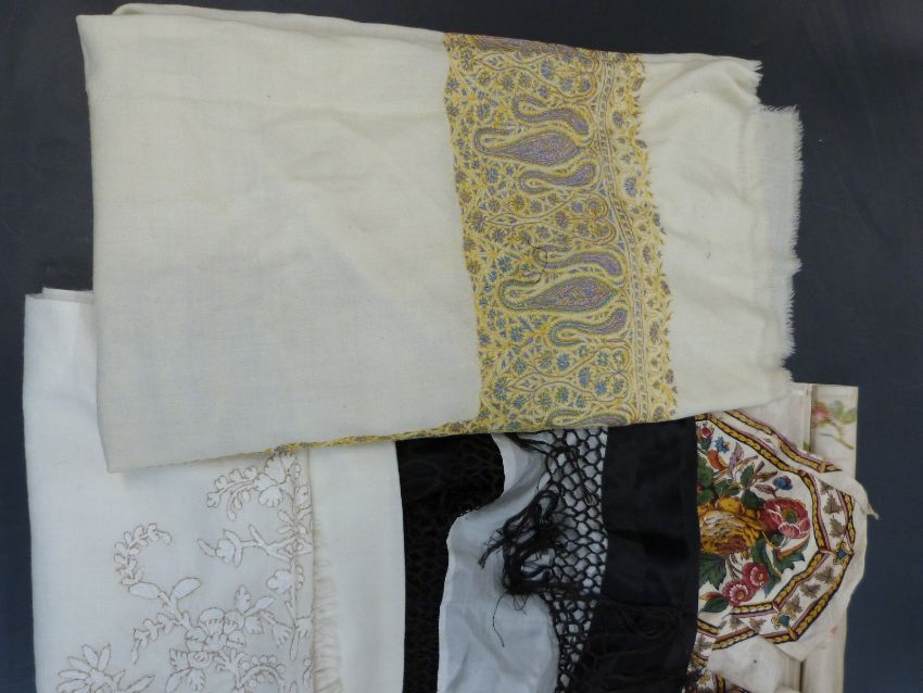 Edwardian black scarf/shawl with embroidered decoration, velvet trim and fringed border, an ivory coloured lace shawl, woollen shawl with paisley design, ivory coloured wool shawl with embroidered gold thread decoration, small bolt of printed silk material etc