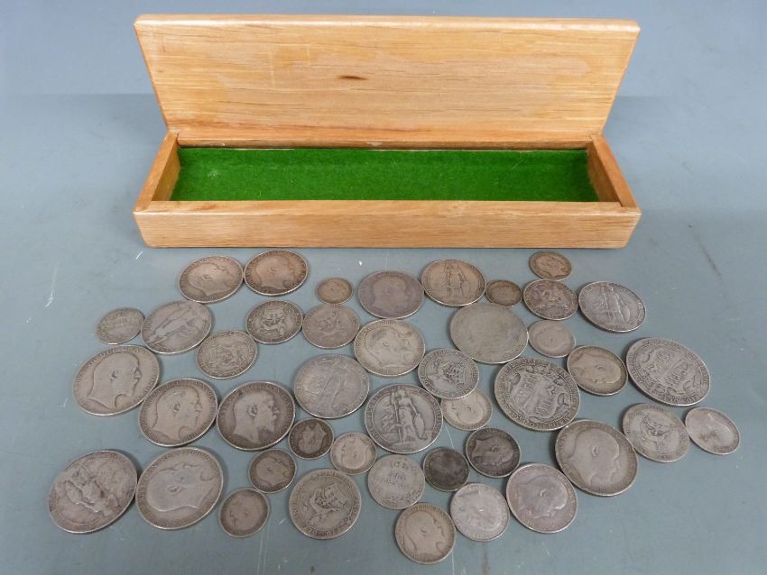A collection of Edward VII silver coinage to include 1904, 1906 and 1907, a good quantity of Florins etc, approximately 300g total, in a wooden box
