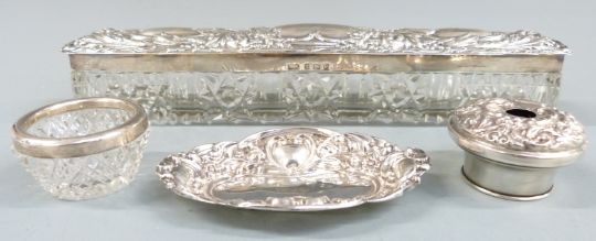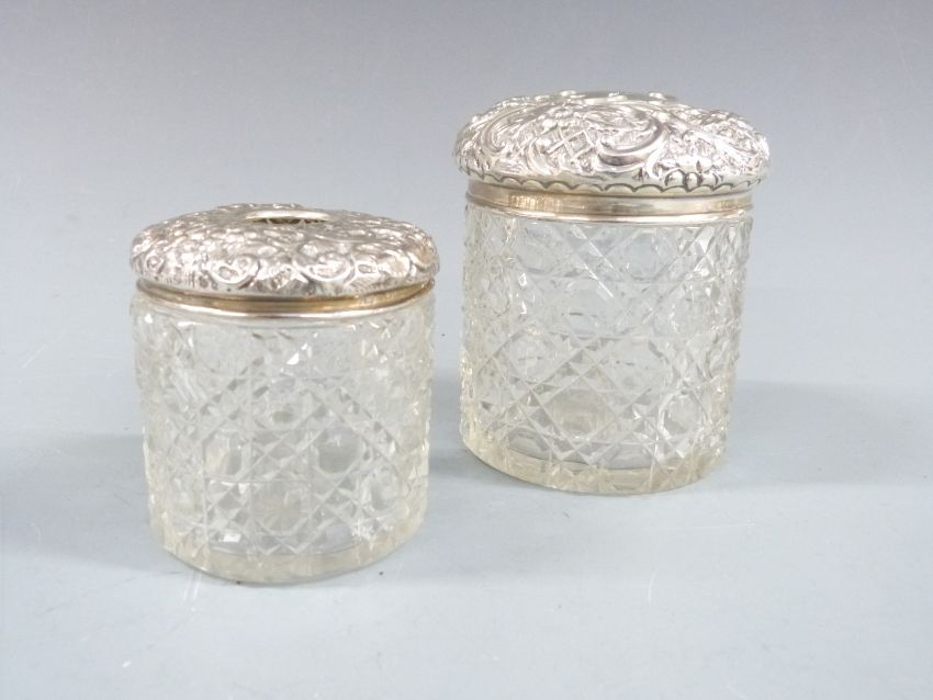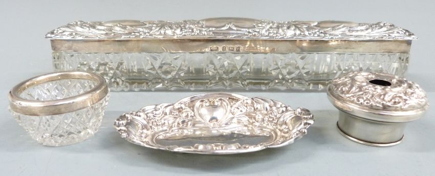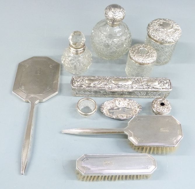 Quantity of hallmarked silver mounted dressing table items including hand mirror, two brushes, six silver mounted and lidded items including globe shaped bottle, further hallmarked silver lid and a small hallmarked silver pin dish