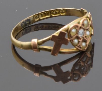 Victorian 9ct gold ring set with a diamond and seed pearls in a heart shaped setting, with an anchor and a cross to the shoulders, together representing faith, hope and love or charity, Birmingham 1874, size O