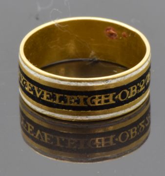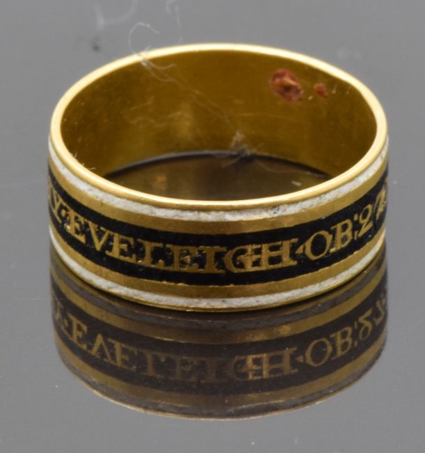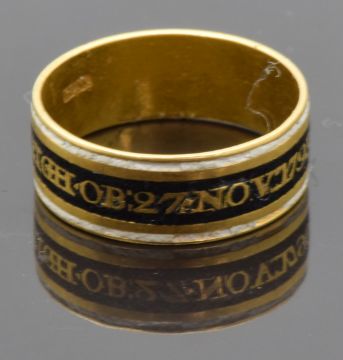 Georgian 18ct gold mourning ring set with black and white enamel reading "Dorothy Eveleigh Ob 27th November 1799 aged 45", hallmarked London 1799, maker W.H, size M/N, 4.12g