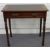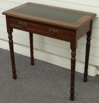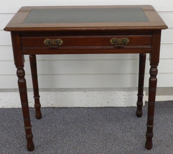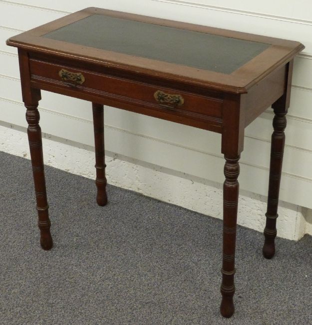 Mahogany hall table with inlaid leather top, single drawer and brass drop handles, raised on turned legs, W76 x D43 x H74cm
