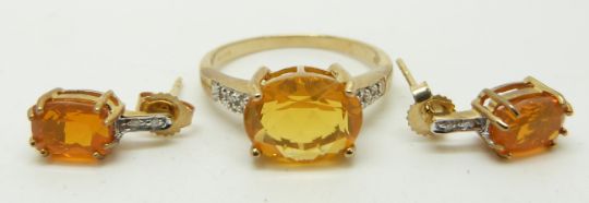 A 9ct gold ring set with an oval cut fire opal and diamonds and a pair of similar earrings, 3.6g, size N