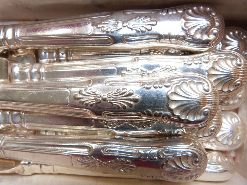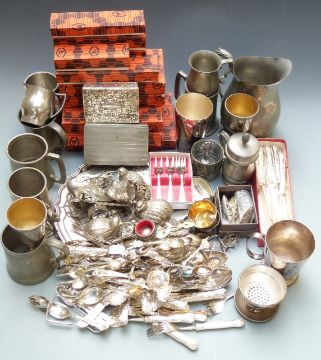 Silver plated ware including a quantity of boxed King's pattern cutlery, salver, pewter tankards etc