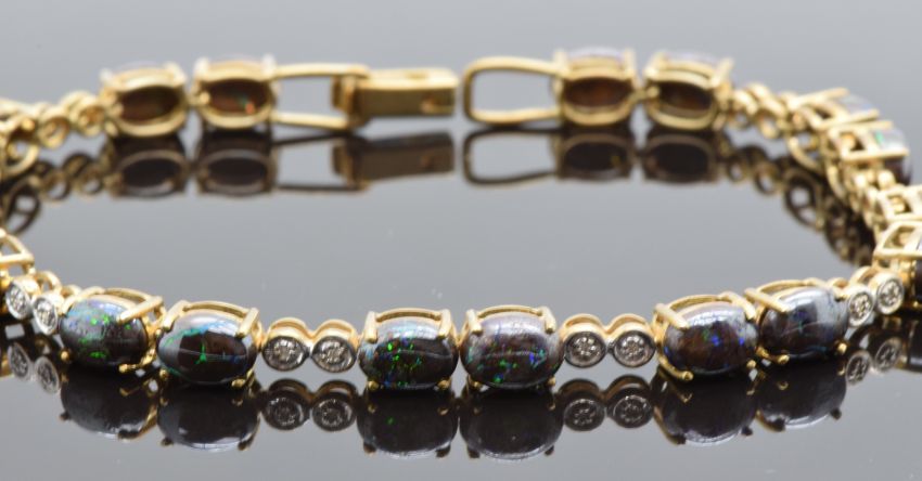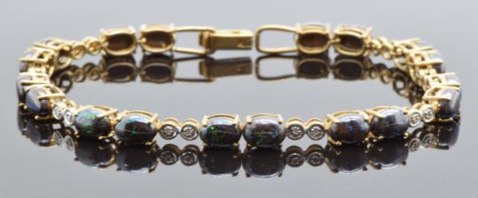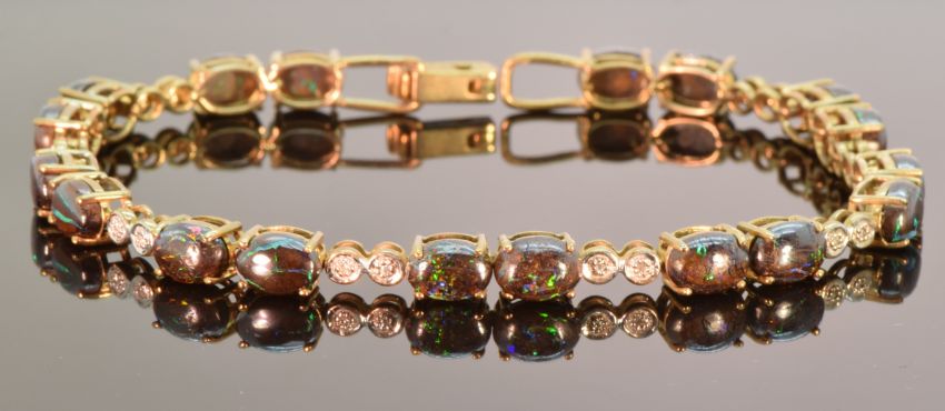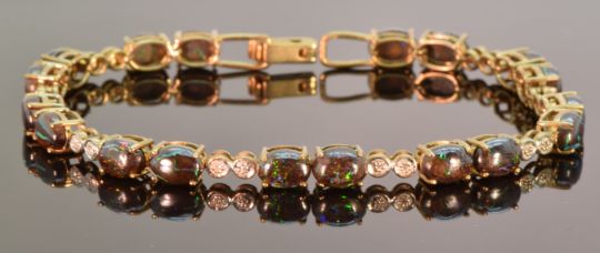 A 9ct gold bracelet set with Australian boulder opal cabochons and diamonds, 11.2g