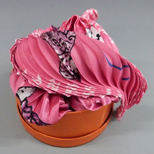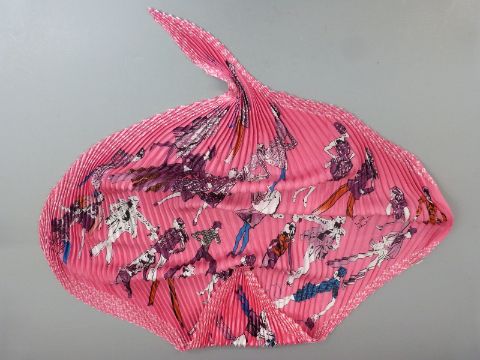 Hermès pleated silk scarf decorated with figures and Printemps Été 69, Automne Hiver 70 and Hermès Paris, in original circular box, 90 x 90cm