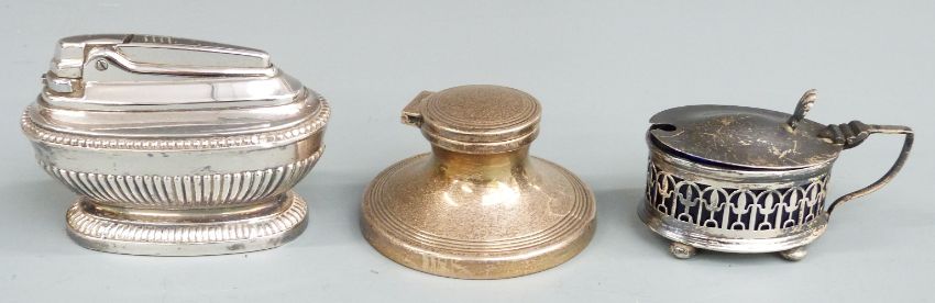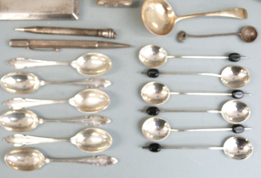 Hallmarked silver items to include cigarette case, two sets of six spoons, napkin ring, mustard with blue glass liner, capstan inkwell, baby's rattle and two propelling pencils, 310g weighable silver, together with a 19th century pencil miniature drawing of a girl, plated lighter etc