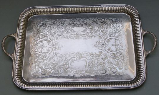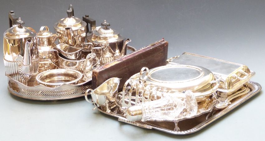 Silver plated ware to include two large trays, length of larger 55cm, teaset, wine coaster, entree dishes, toast rack etc