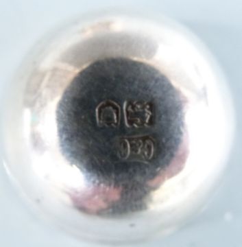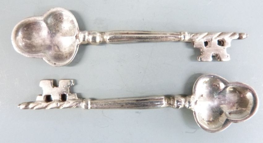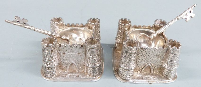 Carrington & Co George V pair of novelty hallmarked silver salts formed as castles, the spoons formed as keys, London 1910, height 3.5cm, weight 225g