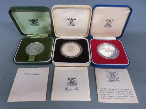 Royal Mint Royal commemorative silver crowns comprising 1972, 1977 and 1980, all cased with certificates