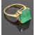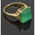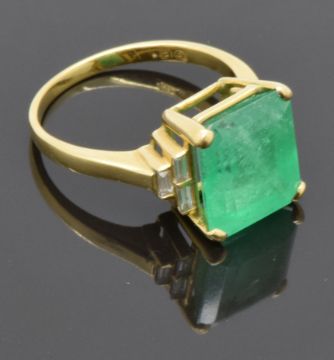An 18ct gold ring set with a natural emerald cut emerald of approximately 5.97ct and three baguette cut diamonds to each shoulder, size O