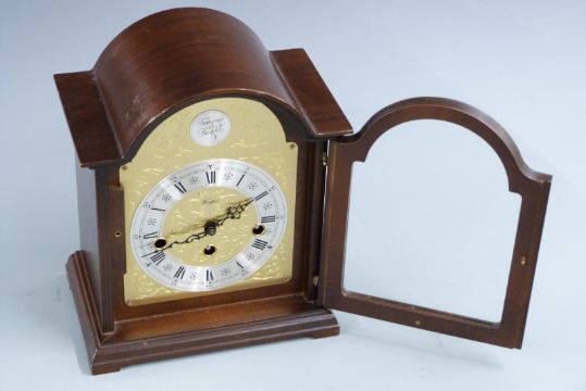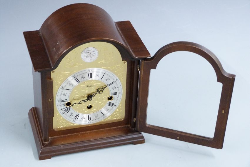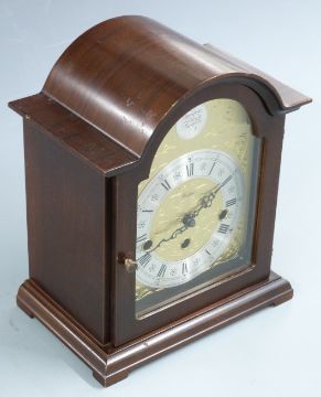 Woodford mid 20thC bracket clock, three train Westminster chime German movement, in dark wood case, 25cm tall