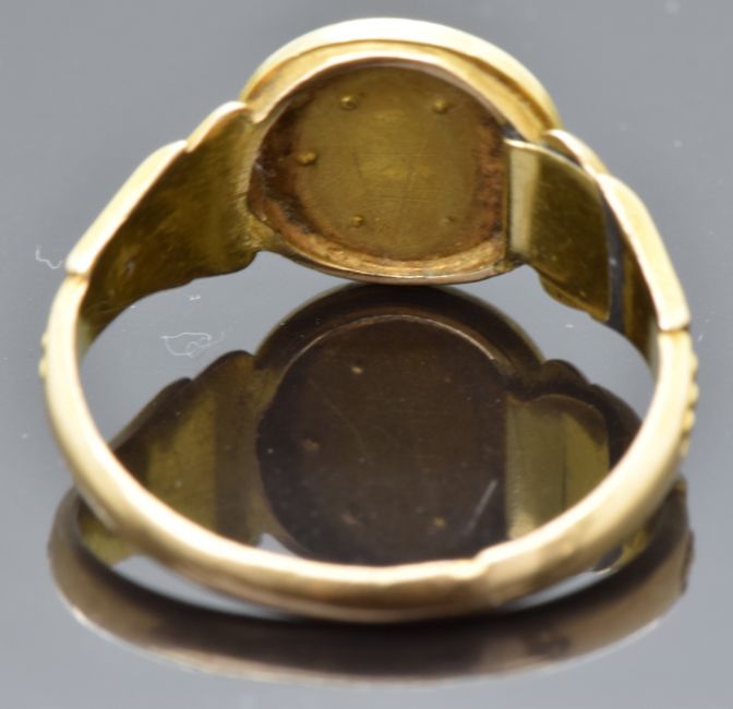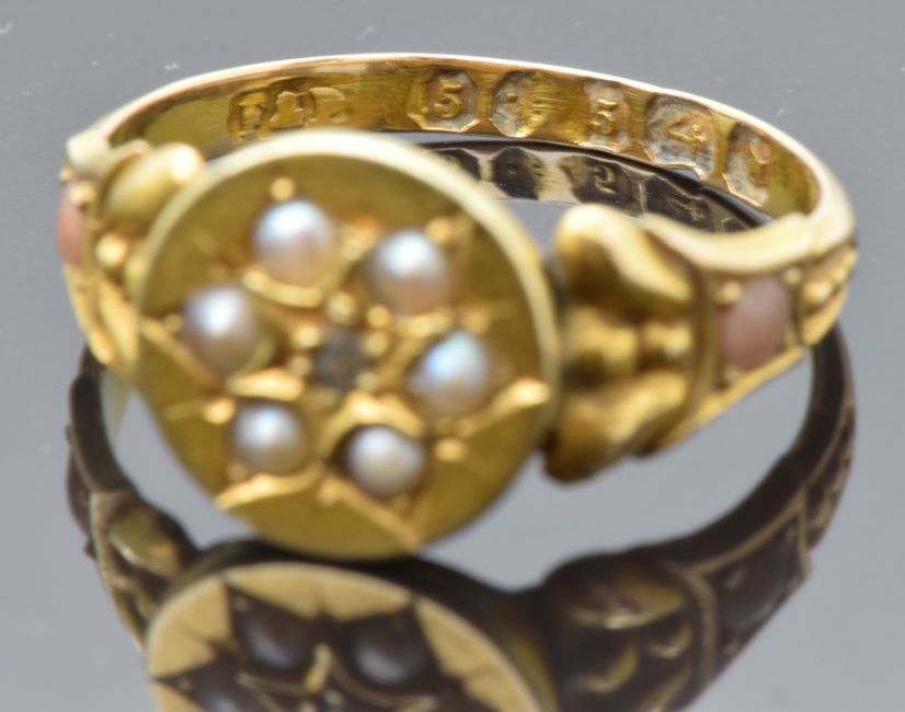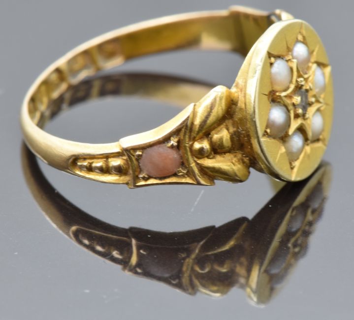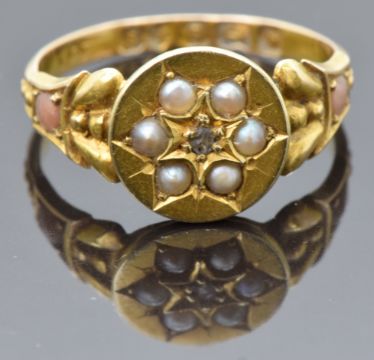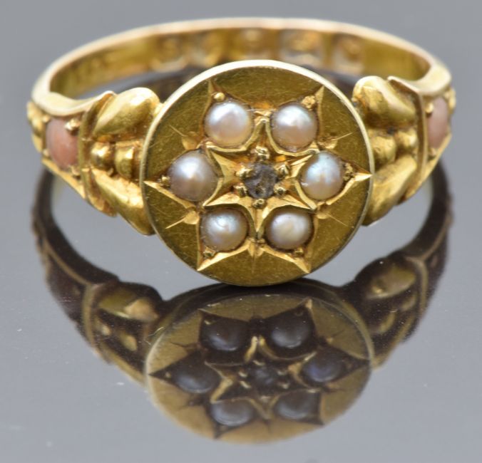 Victorian 15ct gold ring set with a diamond surrounded by seed pearls, the shoulders set with coral cabochons, Birmingham 1878, maker F&P, size N