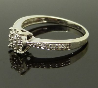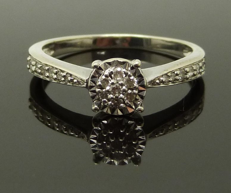 An 18ct gold ring set with diamonds in a cluster and further diamonds to the shoulders, size K/L, 1.86g