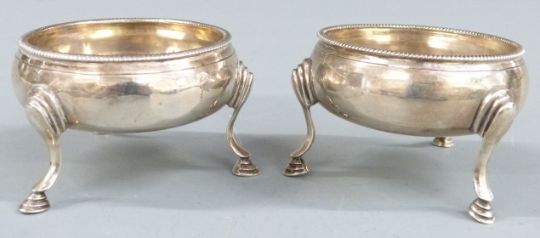 Two Georgian hallmarked silver salts raised on three feet, London 1781 and 1785 maker Thomas Shepherd, diameter 7cm, weight 79g