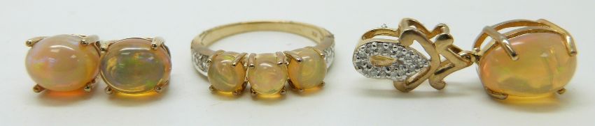 A suite of 9ct gold jewellery set with opal cabochons comprising pendant, ring (size N), and earrings