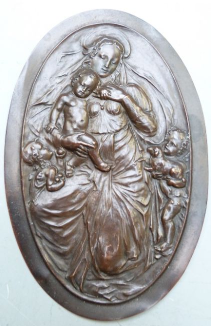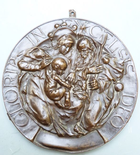 Two late 19th or early 20thC plaques by the Bromsgrove Guild (who also produced the gates for Buckingham Palace), one marked lower right, and pin dish set with cold painted bronze finch