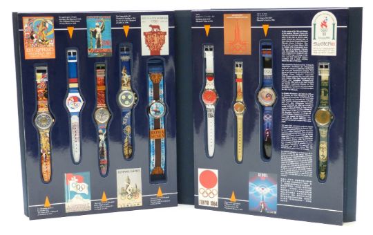 Swatch Historical Olympic Games Collection Atlanta 1996 with nine watches comprising Atlanta 1996, Seoul 1988, Moscow 1980, Tokyo 1964, Rome 1960, London 1948, Los Angeles 1932, St. Moritz 1928 and Stockholm 1912, in original display box with outer sleeve.