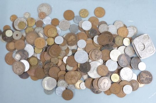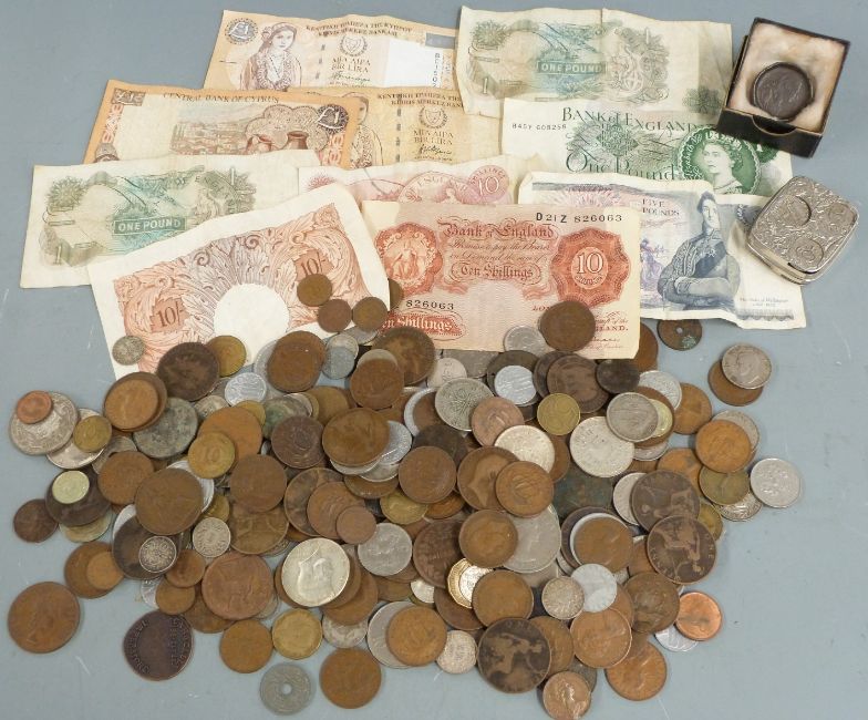 A collection of UK and overseas coins and banknotes, coin holder etc in a cash tin, small silver content