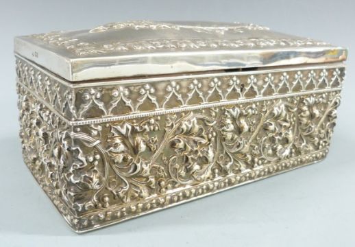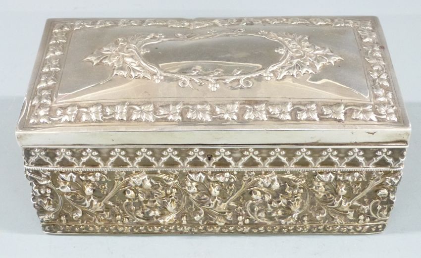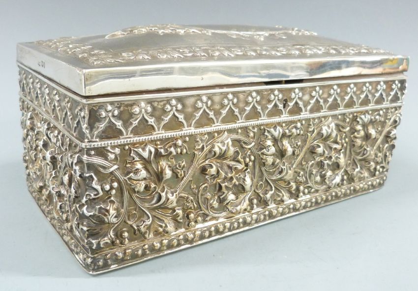Mappin & Webb Victorian hallmarked silver desk top box with embossed decoration, London 1889, width 24cm
