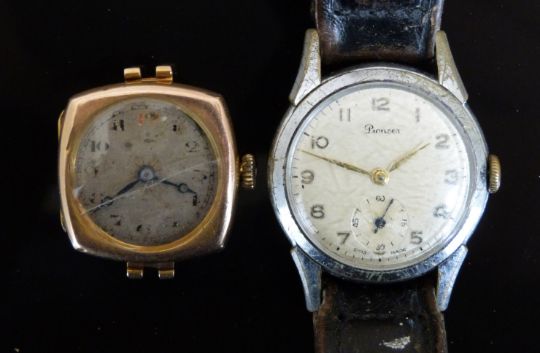 Swiss 9ct gold wristwatch with blued Breguet hands, Arabic numerals, silver dial and cushion shaped case, case diameter 30mm together with a Pioneer gentleman's wristwatch with inset subsidiary seconds dial, gold hands, Arabic numerals and silver dial, on black leather strap, case diameter 36mm.