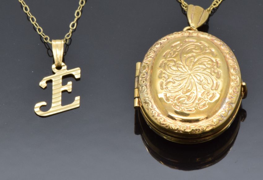 A 9ct gold locket and chain and a 9ct gold 'E' pendant and chain, 5.5g