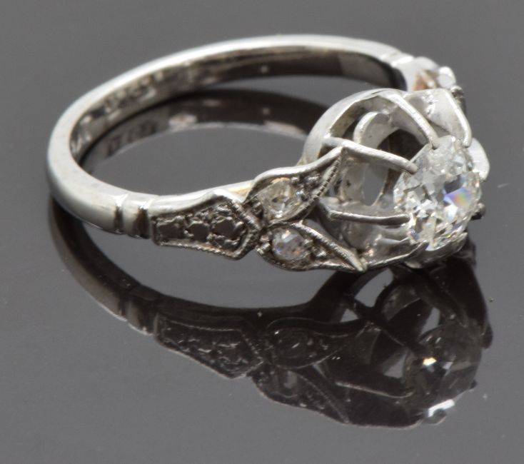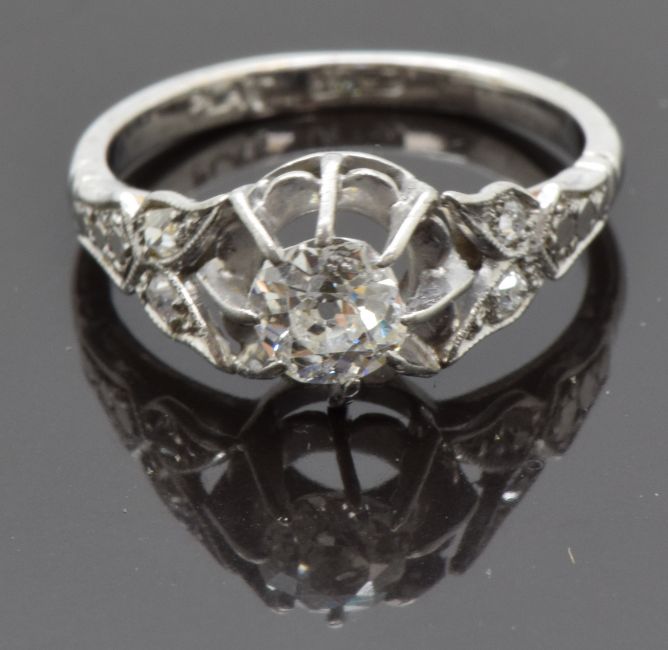 Victorian 18ct white gold and platinum ring set with an old cut diamond of approximately 0.6ct with further diamonds to the shoulders, size I/J, 3.00g