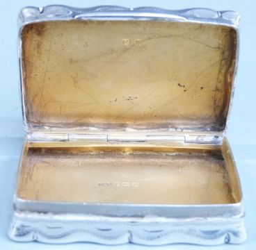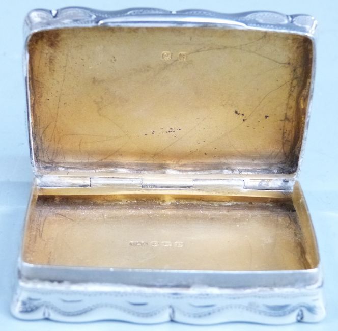 George V hallmarked silver snuff box in the Georgian style, with shaped edge and gilt interior, Birmingham 1926 maker's mark T&P, length 6cm, weight 46g