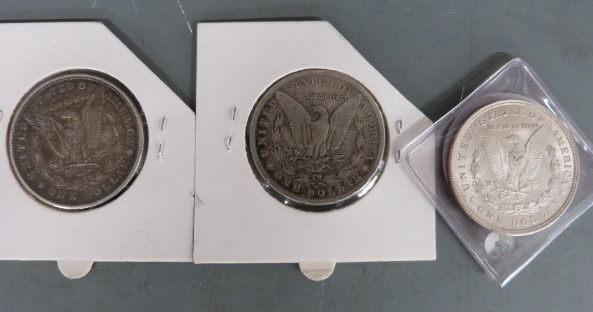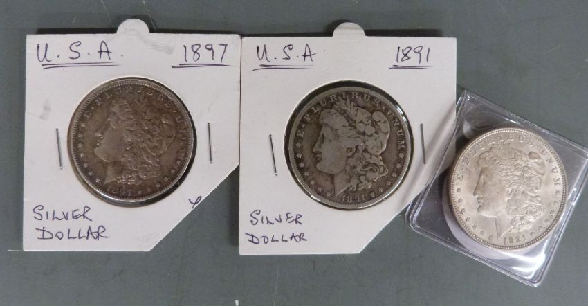 Three USA Morgan silver dollars, 1891, 1897 and 1921
